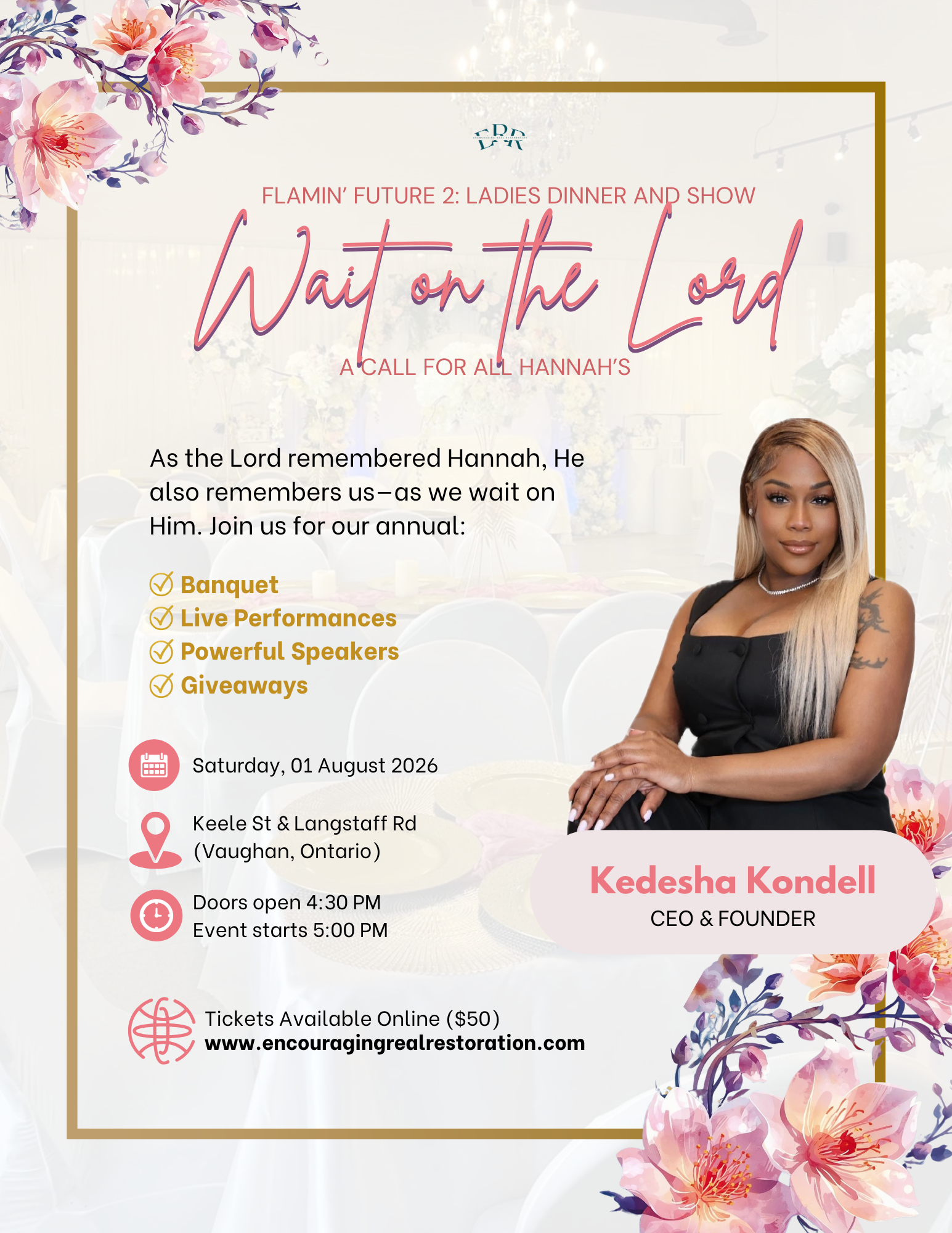 Our 2026 annual dinner and show explores the theme “Waiting on Miracles.” Ladies, come and receive insight into what that journey looks and feels like for us.